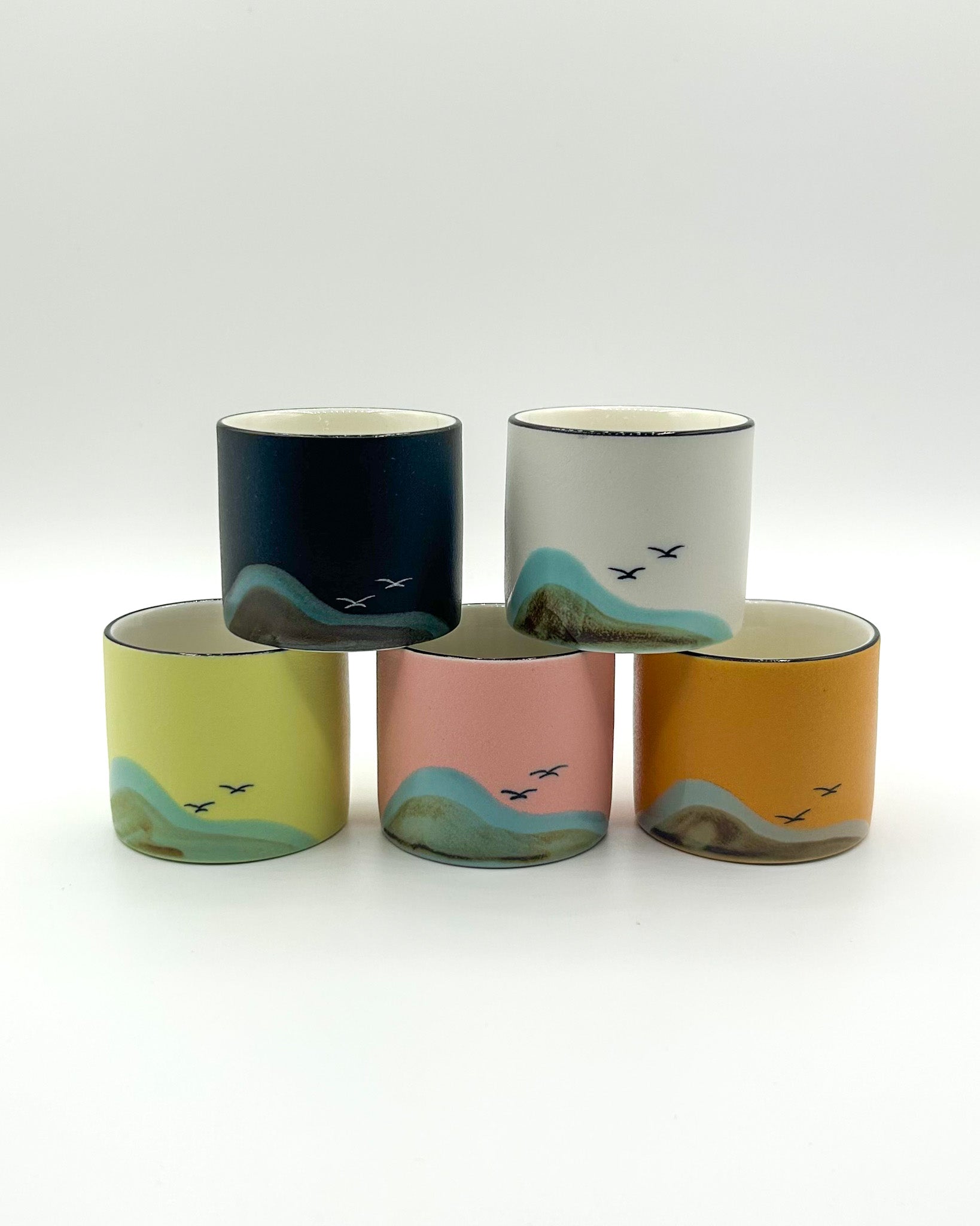 Deze set van 5 espresso kopjes met onder andere vogel markeringen erop.