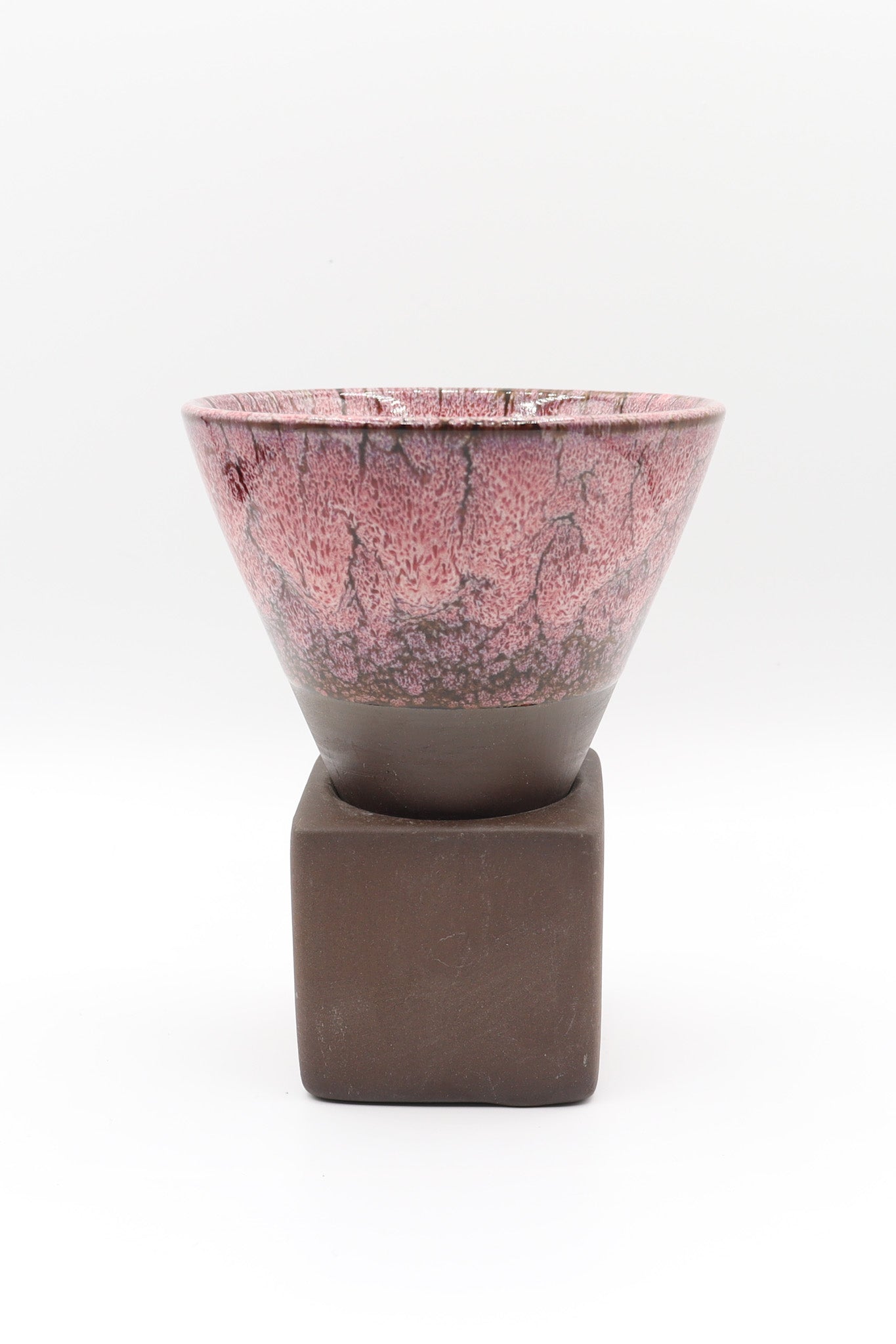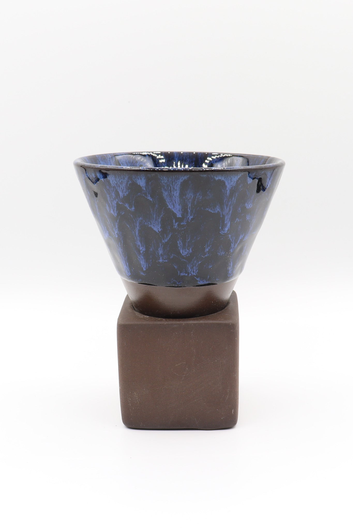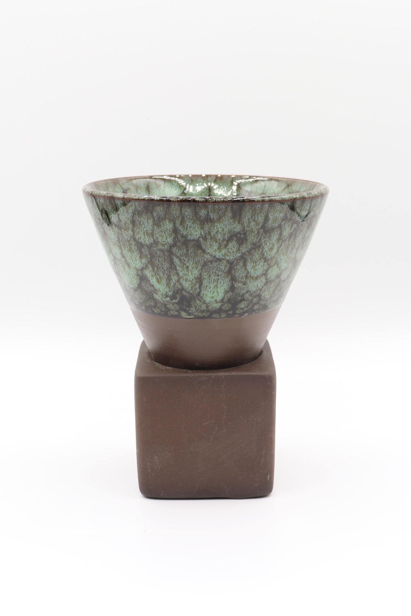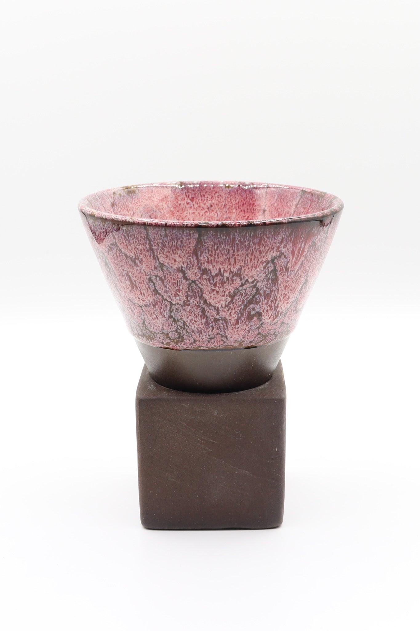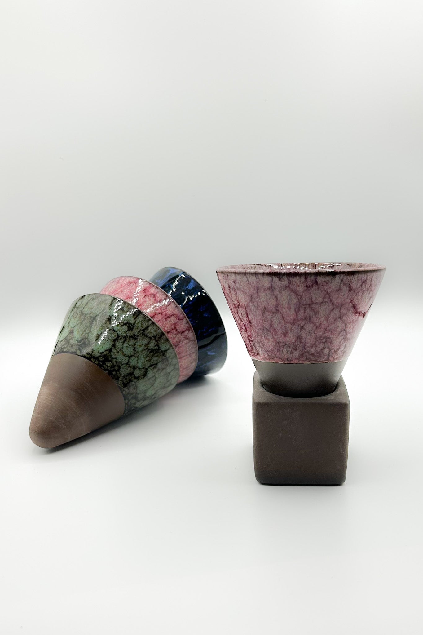 Kegelvormige porseleinen kopjes met een aardewerk voetstuk. Een set van 4 verschillende kleuren met een glanzende afwerking.